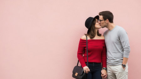 A stylish young couple shares a romantic kiss against a vibrant pink backdrop, embodying love and connection.