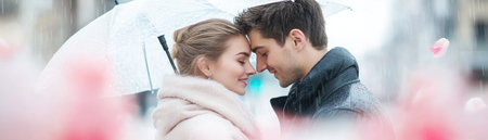 A romantic couple, sheltered under an umbrella in a gentle rain, are surrounded by scattered rose petals Their intimacy and affection bloom amidst the drizzle, a poignant scene of love's resilience The soft rain enhances their closeness, creating a magical, romantic moment where delicate petals symbolize their enduring love AI Generative