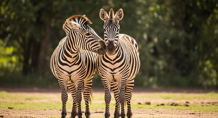 In the field, two zebras stand with background trees. Image generated with Generative AI