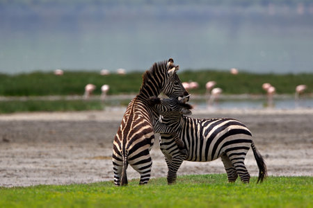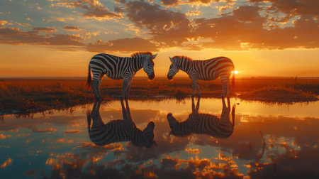 Twilight Tranquility. A Pair of Zebras and Their Perfect Reflections in Calm Waters