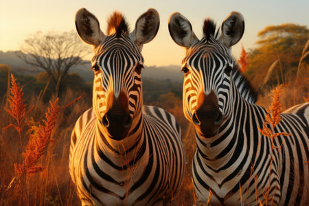 Zebras in the African savanna against the backdrop of beautiful sunset. Serengeti National Park. Tanzania. Africa. AI Generated.