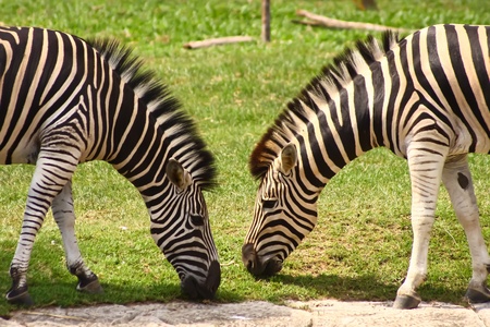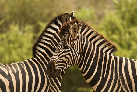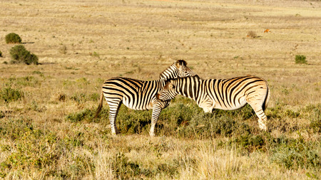 Zebras grazing in a National Park, South Africa. Two plains zebras in natural environment