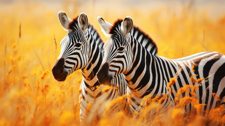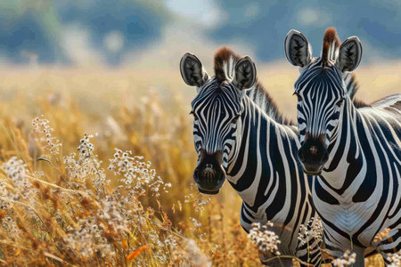 Two plains zebras, Close-up shot of two zebras standing in a grassy field Ai generated
