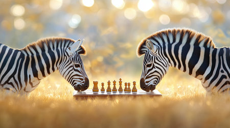 Two playful zebras concentrate on a hand carved chessboard, surrounded by tall golden grass as twilight casts a serene glow.