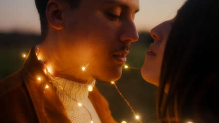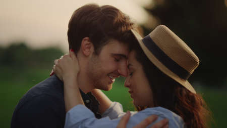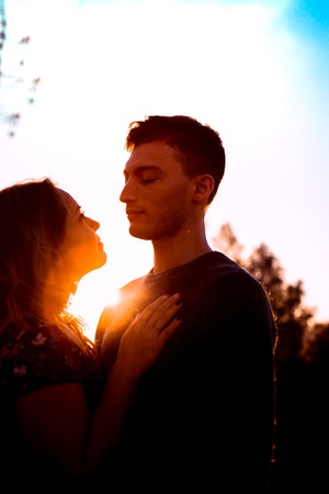 Young couple in love spends time together. Embraces of a loving couple on sunset. Man embracing and going to kiss sensual woman.