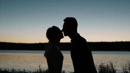 Silhouette of a couple in love at sunset in front of a river. Video. Side view of a man and a woman kissing during romantic date, concept of love.