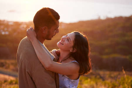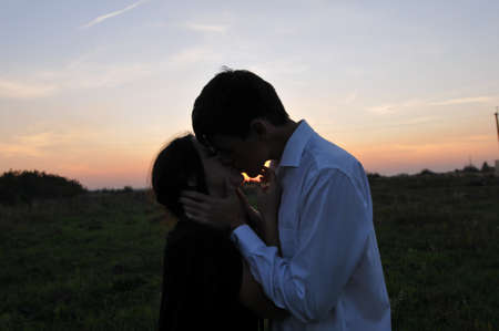 Embraces of a loving couple on sunset. Young couple in love hug each other. Love story.
