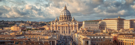 Golden light reflects off Vatican rooftops, creating a serene atmosphere as clouds float in the sky, illuminating the iconic buildings at dusk.
