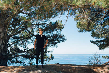 Adventurous Traveler Standing Alone on Mediterranean Coast, Embracing the Freedom in a Beautiful Seascape