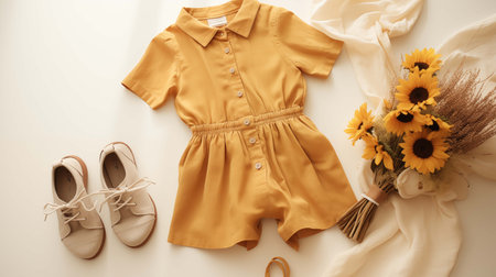 Mustard yellow short sleeve romper with beige shoes ai generated background image. Bouquet of sunflowers desktop wallpaper picture. Joy of summer photo backdrop. Babyhood concept composition top view