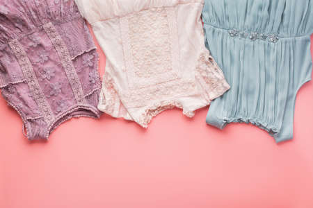 Girls fashion background lace and tulle dresses in pastel colors on pink, top view, selective focus