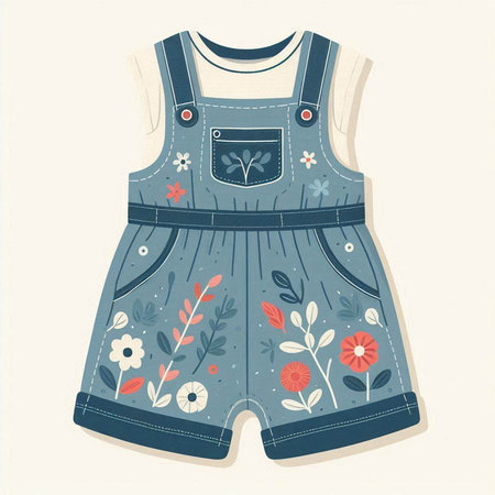 Childrens summer jumpsuit with flowers and leaves. Vector illustration.