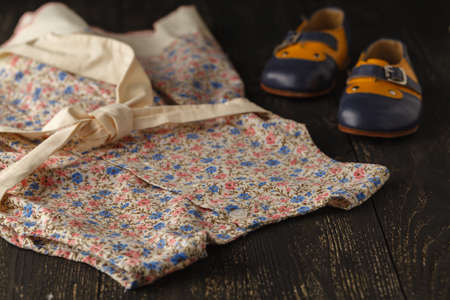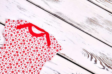 Baby-girl vintage design clothes. Newborn baby-girl short sleeve patterned apparel, old wooden background, top view.