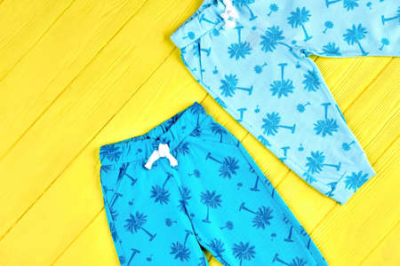 Babies blue patterned trousers. Infants new pants on yellow wooden background. Toddler kids high quality clothes.