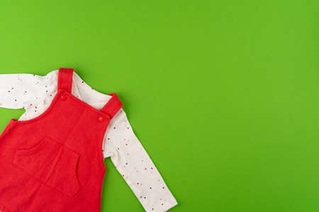 Top view of baby clothes on green background