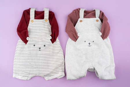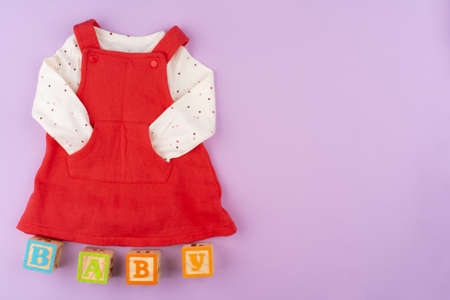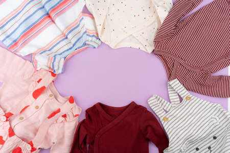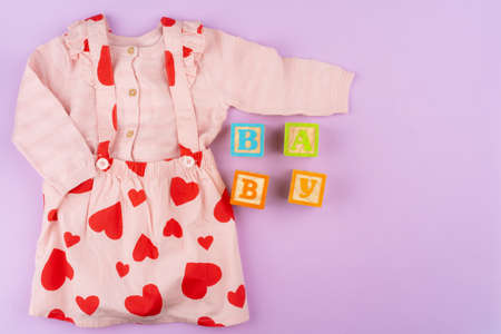 Baby girl clothes on lilac pastel background