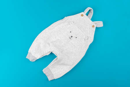 Top view of baby clothes on blue background