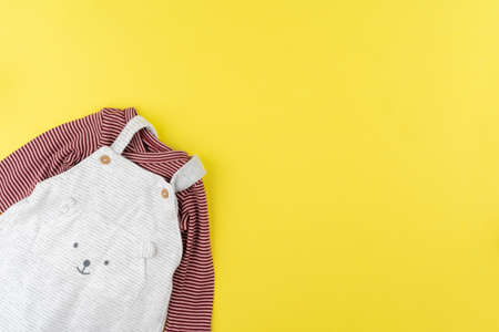 Infants patterned organic romper. Newborn kids top quality bodysuit on yellow background, copy space.