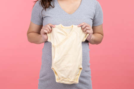 Asian pregnant woman holding baby cloth for baby newborn isolated on pink background. Pregnant woman packing baby stuff ready for the maternity hospital. Pregnancy Proud Prepare for Newborn Concept