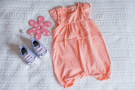 Baby accessories background: light flower dress and shoes for baby gir background with copy space
