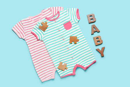 Stylish baby clothes on color background