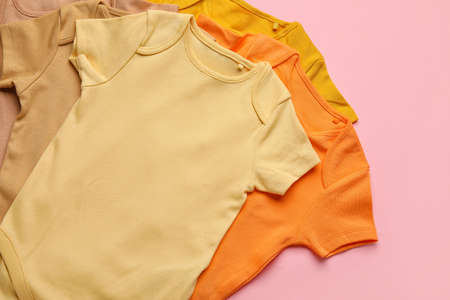 Cotton baby clothes on color background