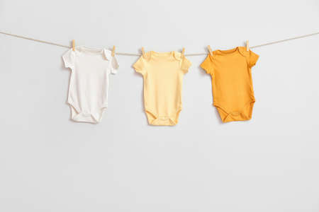 Baby bodysuits hanging on light wall