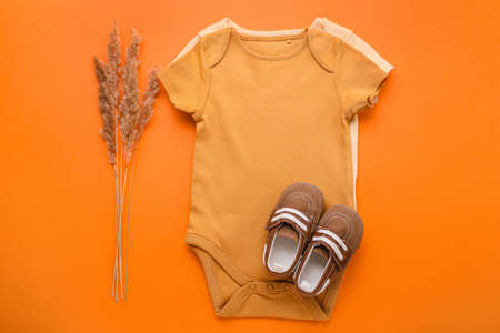 Baby bodysuits, shoes and pampas grass on color background