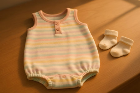 Soft pastel striped baby romper with tiny socks on a wooden surface, cozy newborn outfit evoking comfort, innocence, and preparation for family
