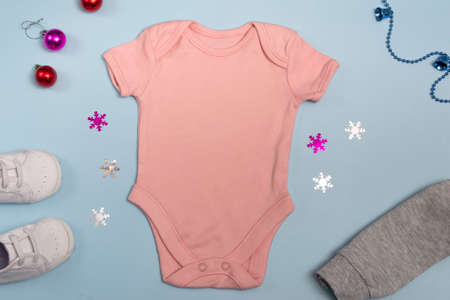 Mockup of New Year's pink bodysuit on a blue background, decorated with white sneakers, red pants and Christmas tree decorations, top view.