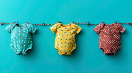 Three short-sleeved baby bodysuits in teal with white dots, yellow with blue dots, and brown with white dots are clipped to a thin rope against a vibrant turquoise background. The onesies are neatly displayed, suggesting baby clothing or laundry drying. The bright colors and simple setup create a cheerful and clean aesthetic.