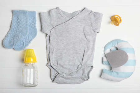 Flat lay of baby boy bodysuit with malk bottle. Baby background
