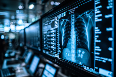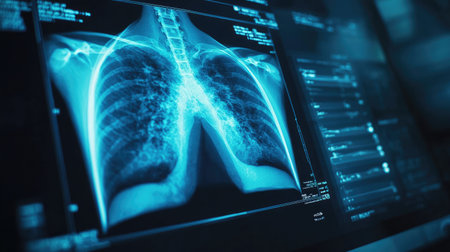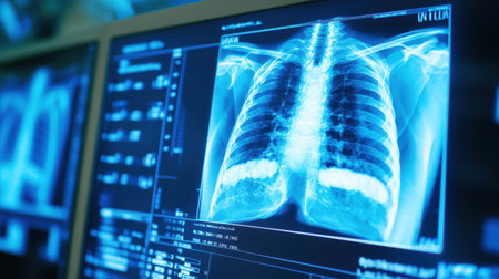 High-quality radiographic image of human lungs on digital monitors, emphasizing advanced medical technology used for lung health analysis and diagnosis in a healthcare setting.