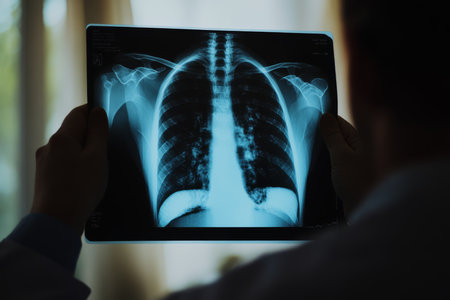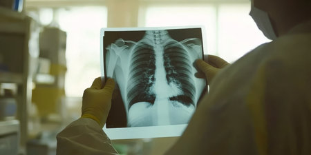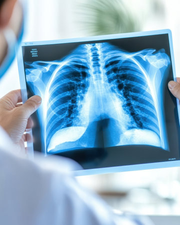 An experienced medical professional carefully examines a detailed chest Xray to thoroughly assess lung health and identify any potential diseases, thus ensuring patient safety and overall wellbeing