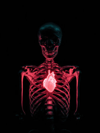 A detailed skeleton displays a luminous heart at its center, creating a striking contrast against the dark background, emphasizing human anatomy and vitality.