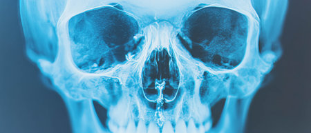 Detailed X-ray of human skull highlighting empty eye sockets and intricate anatomical features