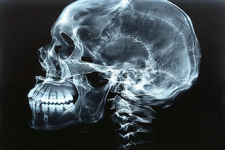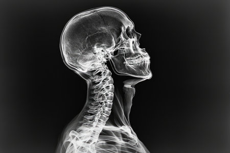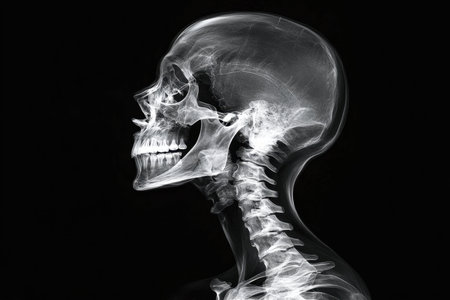 A detailed x-ray showcases a side view of a human skull and cervical spine. This illustration emphasizes the intricate bone structures for educational and medical analysis.