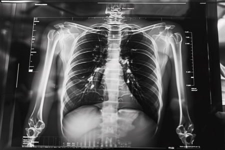 High-resolution X-ray image depicting the chest area, highlighting the rib cage and spinal structure, useful for educational and medical purposes.