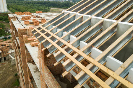 Residential house with wooden roof frame structure under construction. Unfinished brick building under development.