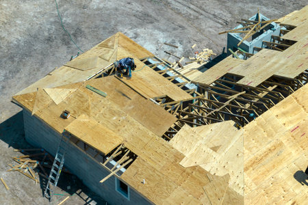 Aerial view of builders working on unfinished residential house with wooden roof frame structure under construction in Florida suburban area