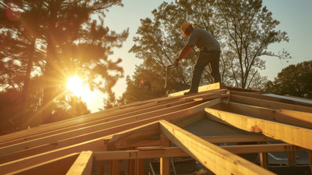 Worker holding lumber wood plank on rooftop with golden sky, install and build new house. Renovation, improvement for exterior residential by professional builder. Housing and construction concept