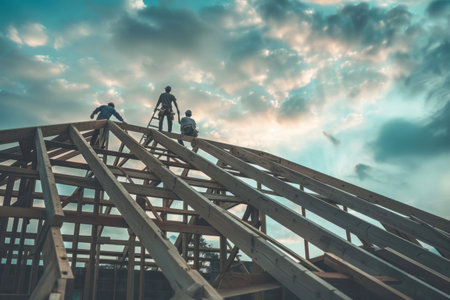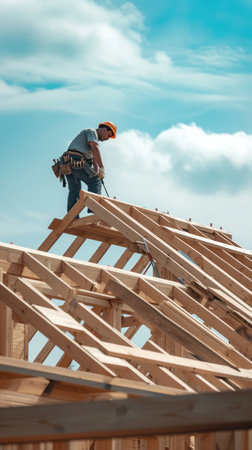 Building contractor carpenter placing new building wood engineered trusses on a residential under construction