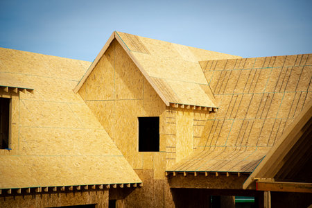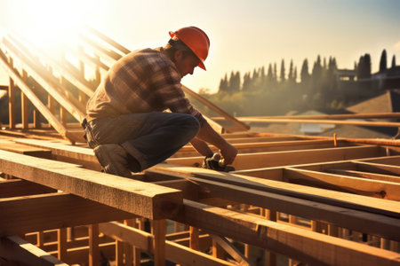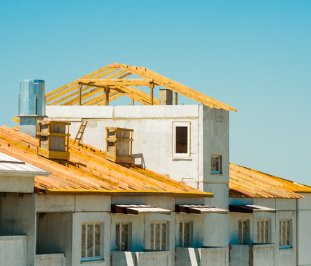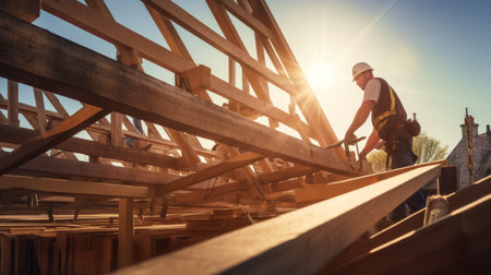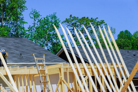 Constructing roof framework using wooden beams in suburban neighborhood on works area