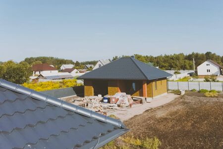 House roofing. Roofer builder build roof. Roofing tiles of the new roof under construction building. Repairing building roof. Repair roofs, install roofing, renovate house. Frames roof.