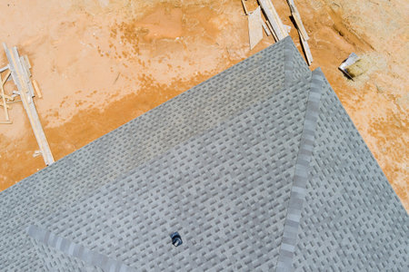 Roofing is covered with asphalt shingles on roof top of newly constructed house