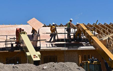 Builders working on roof construction of unfinished residential house with wooden frame structure in Florida suburban area. Housing development concept