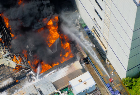 Emergency unfolds as intense flames ravage an industrial warehouse, with fire trucks on site fighting the fierce blaze under a smoky sky.. AI Generation