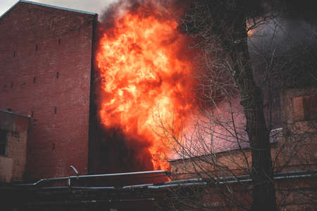 Massive large blaze fire in the city, brick factory building on fire, hell major fire explosion flame blast, with firefighters team firemen on duty, arson, burning house destruction