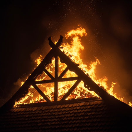 Dramatic Blaze: Rooftop Engulfed in Smoke and Flames