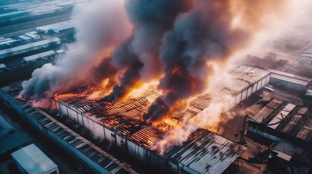 remains of industrial building after catastrophic fire, with smoke still rising from the wreckage, created with generative ai